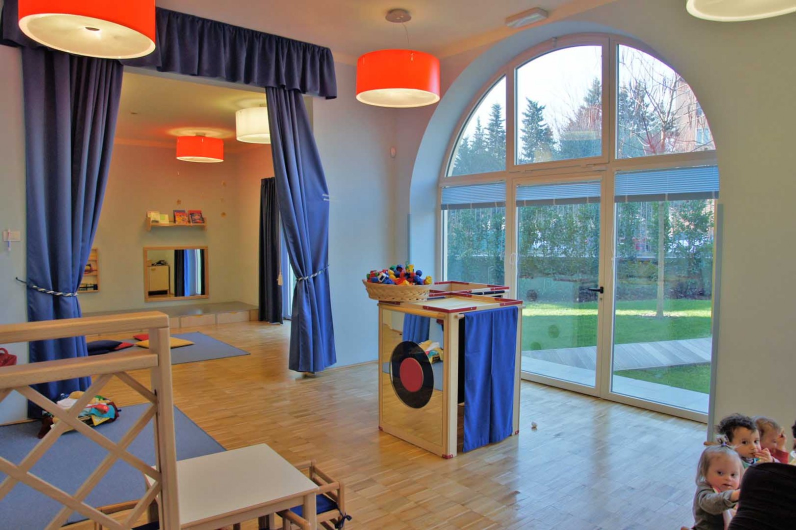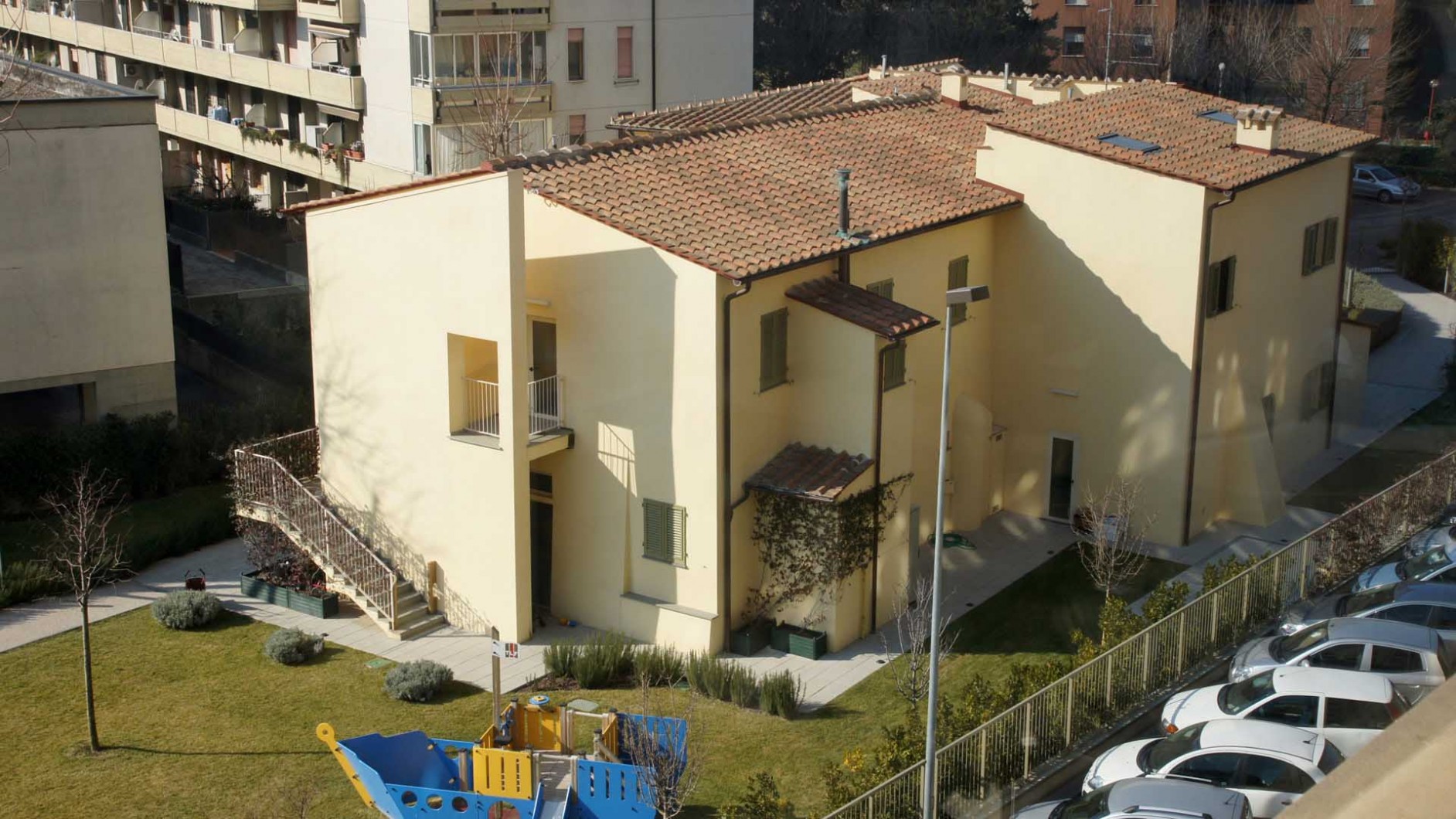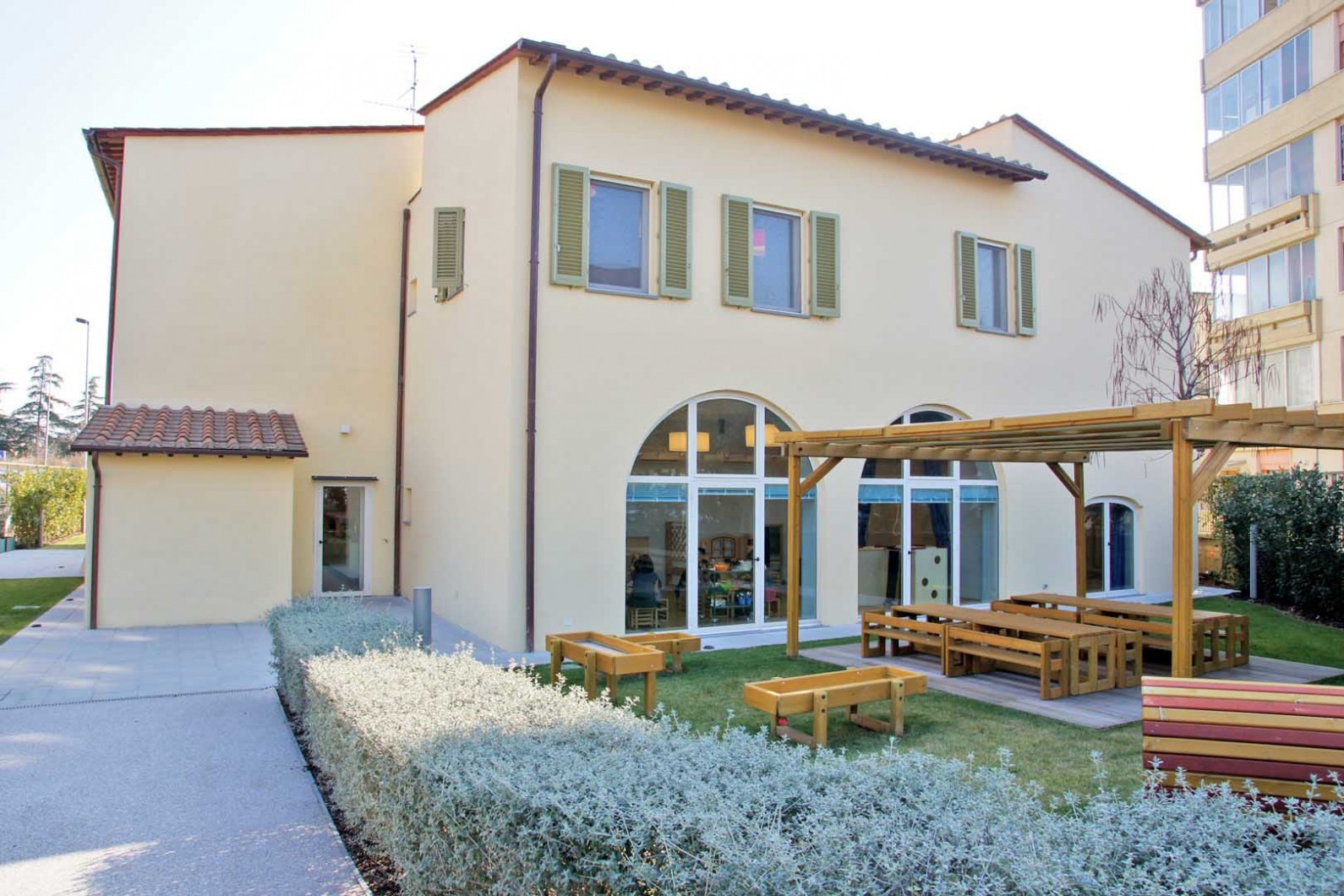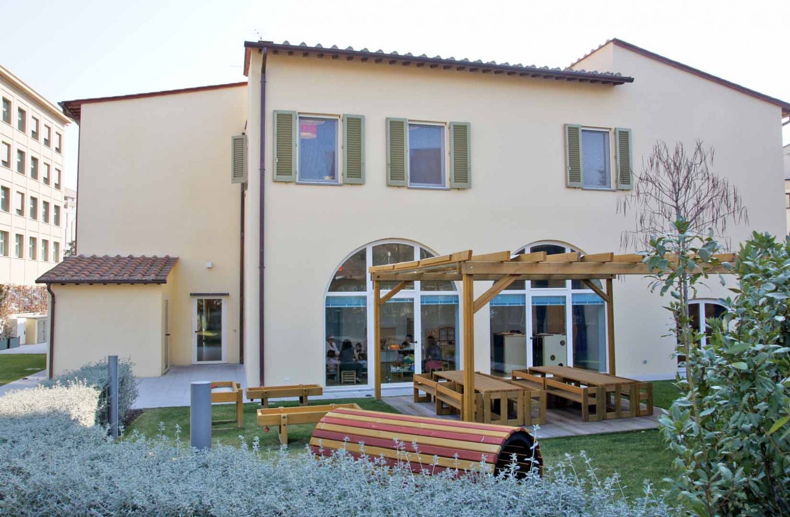 In un immobile vincolato dalla Soprintendenza, situato a Firenze nei pressi della nuova sede della Cassa di Risparmio, il Comune di Firenze ha deciso di realizzare un asilo nido aziendale per i dipendenti della Cassa. La villa, risalente probabilmente alla prima metà dell’ottocento si è trovata inserita in un contesto ambientale, risultato dell’urbanizzazione del secondo dopoguerra. La caratteristica di maggior pregio dell’immobile riguarda la presenza di alcuni affreschi a firma di Ottone Rosai in tre stanze del piano primo. Il progetto nasce con l’obiettivo di adattare e organizzare all’interno della ex villa Bacarelli un asilo nido per circa 65 bambini fra 0 e 3 anni, offrendo una adeguata articolazione in sezioni e attività distinte secondo le esigenze didattiche e di gestione. La soluzione prescelta, distribuisce sui due piani dell’edificio le tre sezioni di asilo nido, sfruttando ogni vano possibile, predisponendo una serie di interventi per riportare i vari ambienti alla stesso livello, dato che allo stato attuale sono presenti molti dislivelli interni.